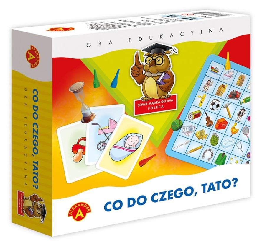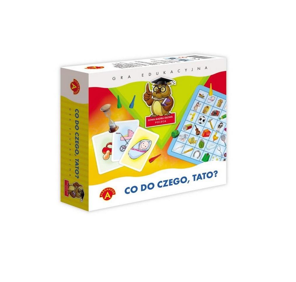 Co do czego, tato?"" to gra dla dzieci w wieku przedszkolnym. Polega na znalezieniu i zebraniu jak największej ilości kart powiązanych z obrazkami umieszczonymi na polach planszy, na których zatrzyma się pionek gracza. Gra rozwija umiejętność logicznego myślenia, wyobraźnię i zdolność skojarzeń. Gra dla 2-4 graczy w wieku od 4 lat.