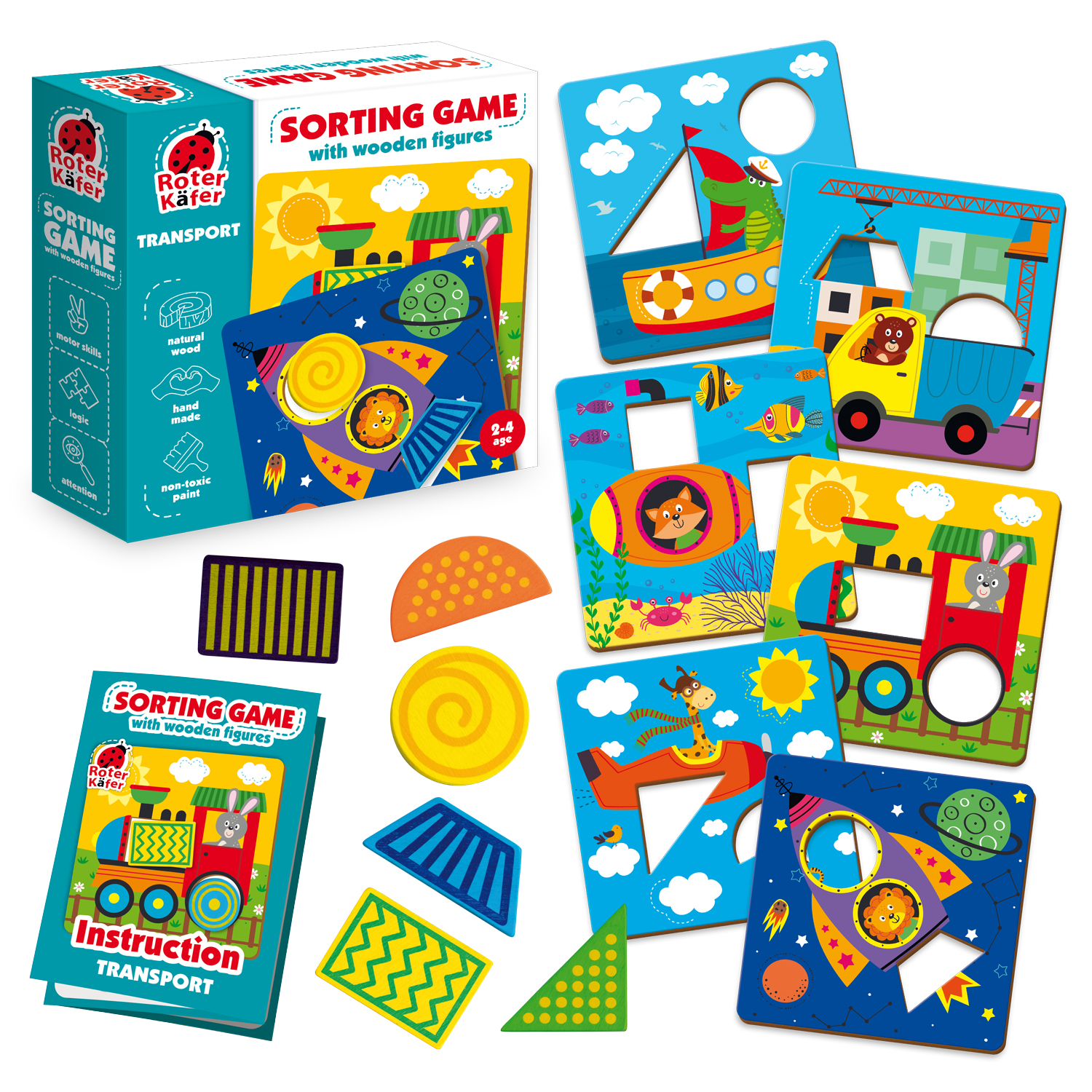Opis produktuZasady bezpieczeństwaPoznawajcie figury geometryczne i kolory w ciekawej formie gry. Wybierzcie dowolną kartę z transportem i szukajcie figur, które uzupełniłyby dowolne obrazki na karcie. Zajączek jedzie w pociągu. Uzupełniamy obrazek błękitnym kołem (koło) oraz żółtym prostokątem (część wagonika). Gotowe! Gra rozwija drobną motorykę, pamięć, koncentrację, wrażenia dotykowe oraz logiczne myślenie. Figurki wykonano z drewna naturalnego. Zawierają wyłącznie bezpieczne farby. Wiek: 2-4 lata.
