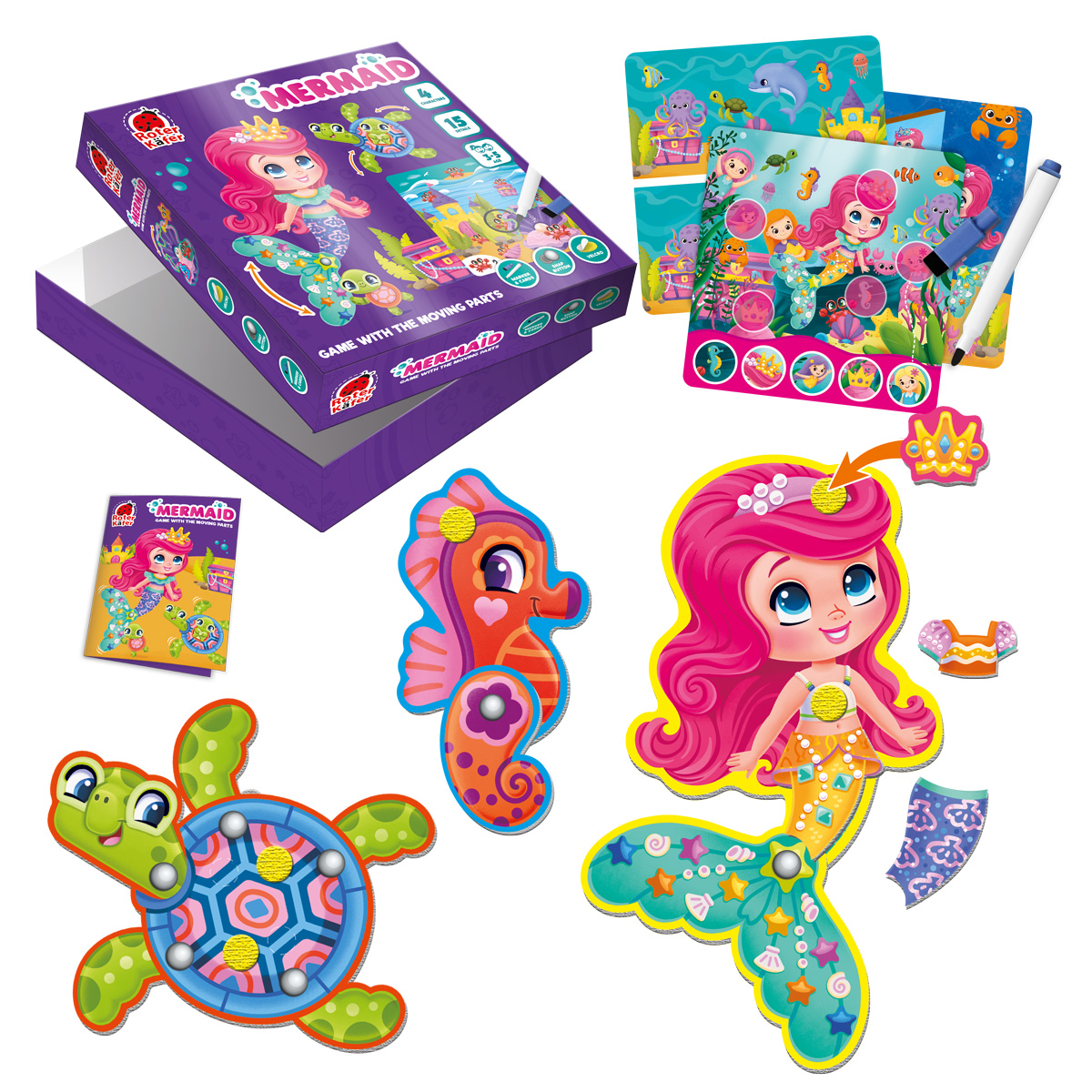 Zestaw zawiera plansze do gry z ruchomymi elementami i dodatkowe detale. Zamocuj te elementy za pomocą rzepów. Przykład: wybierz wizerunek syrenki i dołącz elementy garderoby wraz z akcesoriami. Rusz ogon!