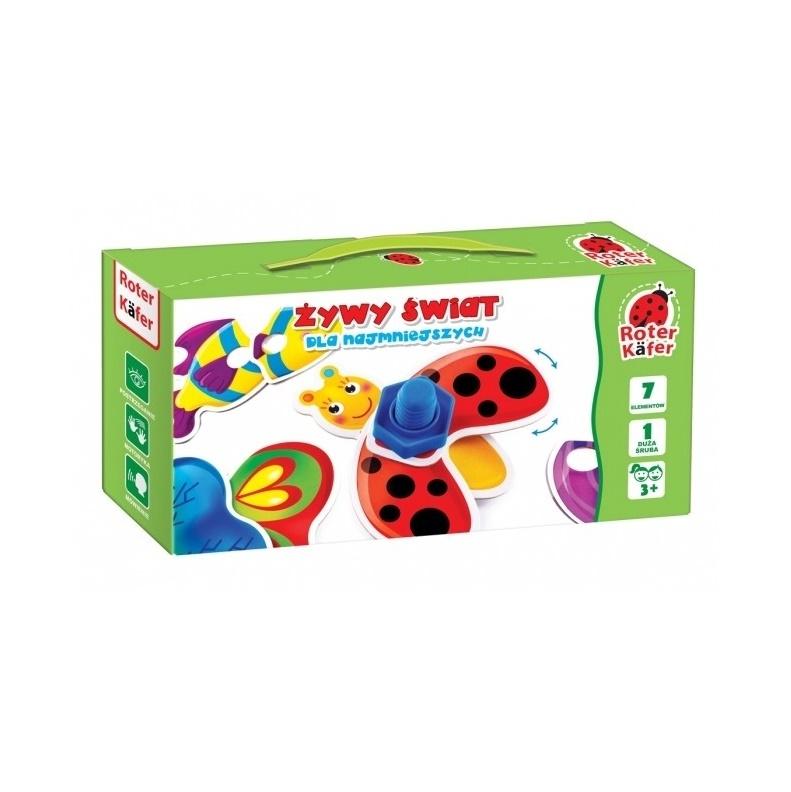 Żywy świat jest taki ciekawy i fascynujący. Poznawajcie go w niezwykłej formie gry. Rozłóż przed dzieckiem kartonowe elementy śrubkę z nakrętką. Niech maluch określi, które elementy są potrzebne dla żuczka, a które dla rybki. Po tym, kolejno skonstruujcie żuczka i rybkę, poruszajcie skrzydłami i płetwami oraz poznawajcie żywy świat. Elementy są dwustronne. Każda strona ma swój kolor. Dzięki temu można urozmaicić proces gry, a także poznać kolory. Gra trenuje drobną motorykę, logiczne myślenie i pamięć. x
