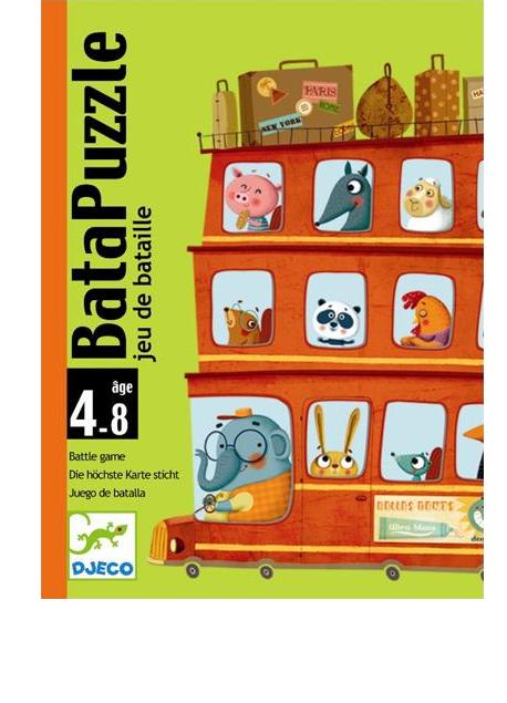 DJECO - DJ05125 - ""BATA PUZZLE"" Gra karciana dla dzieci wiek graczy:od 4 lat ilość graczy:2-3 gra zawiera: 36 karty puzzle,6 kart pojazdów ZWYCIĘŻY ten,kto pierwszy zbuduje swój pojazd narysowany na karcie z kart puzzli. ZASADY Każdy z graczy wybiera karty pojazdy i kładzieje przed sobą ( jesli gra dwóch zawodników wybieraja po 3 pojazdy,jesli gra trzech zawodników wybieraja po 2 pojazdy). Karty puzzle nalezy potasować i rozdać po równo graczom.Każdy z graczy kładzie te karty obrazkiem do dołu w stosiku przed sobą. Gracze w tym samym czasie odracają pierwszą z kart ze stoisku i kładą obrazkiem do góry na polu gry.Karty poza kawałkiem pojazdu,mają również cyfry.Ten z graczy który położył kartę z najwiekszą cyfrą zabiera karty i jesli jest w nich karta z której może ułożyc swój pojazd odkłada ją na bok aby móc układać swój pojazd.. Jesli dwóch graczy wyłożyło kartę z największą cyfrą,wtedy jest ""wojna"".Tych dwóch/trzech graczy bierze kolejną kartę ze stosiku i kładzie ją na polu gry.Wojnę wygrywa znowu karta z nawiększą cyfrą, i wtedy ten kto wygrał zabiera wszystkie karty i wybiera z nich te,które posłużą do ułożenia swojego pojazdu. Gra możne się skończyć ,kiedy jeden z graczy pierwszy ułoży któryś z pojazdów,bądź tyle ile wybrał (2-3) instrukcja http://www.visionone-kids.pl/DJECO-INSTR/DJ05125_PL.pdf