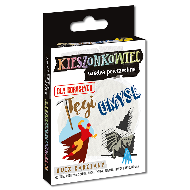 Na te i wiele innych pytań znajdziesz odpowiedź w Kieszonkowcu wiedza powszechna Tęgi umysł. Aż 162 pytania quizowe związane z wiedzą powszechną zapoznają Cię z ciekawostkami z takich dziedzin jak: historia i polityka, geografia, muzyka, sztuka i architektura, film i literatura, chemia, fizyka i astronomia, biologia i medycyna oraz technika. Quiz karciany Tęgi umysł idealnie sprawdzi jako atrakcyjne urozmaicenie każdej towarzyskiej imprezy. Dzięki quizowi zabłyśniesz w towarzystwie i zagniesz znajomych! Do współpracy przy serii Kieszonkowce zaproszono utalentowanych polskich ilustratorów. Tęgi umysł zilustrował Maciej Bohdanowicz, a pytania opracowali Magdalena Witkowska, Marta Stowe oraz Józef K. Serwatka. Sprawdź się w podchwytliwych pytaniach quizowych, a finał Jednego z dziesięciu będzie należał do Ciebie! W serii Kieszonkowce znajdują się towarzyskie gry karciane i quizy do nauki geografii i przyrody, matematyki, języka angielskiego, ćwiczenia myślenia logicznego i rozwijania wiedzy. x