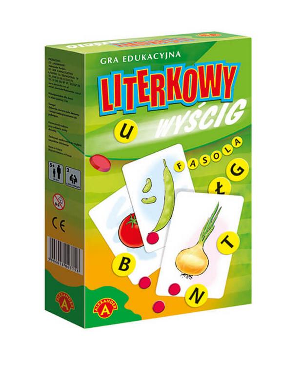 Literkowy wyścig"" to znakomita gra na spostrzegawczość i refleks. Jest również dobrym ćwiczeniem właściwego postrzegania i interpretacji znaku literniczego. Zasady gry są bardzo proste. Gracze na przemian odkrywają kartę, a następnie ścigają się w układaniu z liter właściwego wyrazu pasującego do obrazka na karcie. Wyzwala to wiele emocji i gwarantuje świetną zabawę. Atrakcyjność gry wzbogaca jej frugi, równie interesujący wariant. Gra dla 2 graczy w wieku od 7 lat.