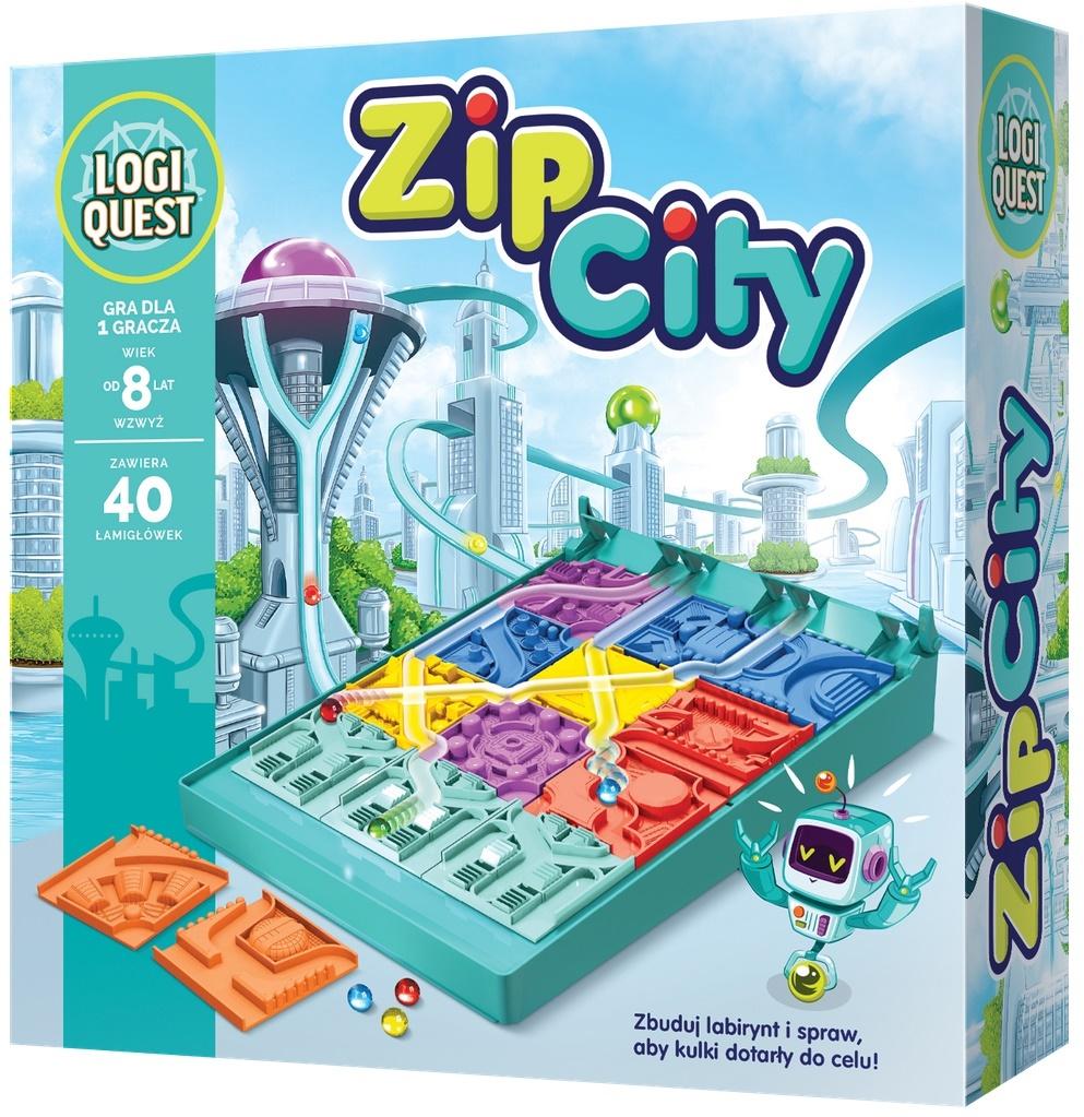Witaj w Zip City - ruchliwym mieście przyszłości, w którym wszyscy podróżują w zip sferach. To kule, toczące się po ogromnych krętych torach, pędząc do celu z prędkością błyskawicy. Poruszają się dzięki sile grawitacji, więc trasa i czas startu każdej z nich muszą być dokładnie zaplanowane! Logiquest: Zip City to gra logiczna, w której wcielasz się w rolę bota - automatycznego kontrolera ruchu. Twoim zadaniem jest kierowanie transportem i przenoszenie całych dzielnic, aby umożliwić pasażerom podróż przez labirynty przecinających się torów. Nie ma czasu do stracenia, bo podróżnych jest coraz więcej, a dzień dopiero się zaczyna! Na czym to polega? Podczas rozgrywki będziesz układać kwadratowe kafelki (kafelki torów miejskich) na pochylonej planszy, łącząc drogi, którymi kulki (zip sfery) przemieszczają się z pozycji startowych do pozycji końcowych zgodnie z wyzwaniami przedstawionymi na kartach zadań. Każda z kart określa, jakich kafelków torów możemy użyć. Twoim zdaniem jest rozmieszczenie ich w taki sposób, by po zwolnieniu blokady kulki dotarły do miejsca przeznaczenia. Czym jest Logiquest? To seria jednoosobowych łamigłówek o prostych zasadach, będących nie lada wyzwaniem dla całej rodziny. Każda z nich dotyczy innego tematu i posiada unikalny mechanizm, pobudzający uczestników do nieszablonowego myślenia. Dzięki elementom wysokiej jakości oraz zagadkom o zróżnicowanym poziomie trudności, łamigłówki z serii Logiquest zapewniają wiele godzin doskonałej zabawy. Dlaczego pokochasz tę grę? Logiquest: Zip City to klasyczna łamigłówka logiczna: z dostępnych elementów musimy ułożyć drogę, która zaprowadzi nas z punktu do punktu. Zasady gry są bardzo proste i umożliwiają samodzielną zabawę nawet dzieciom. W pudełku znajdziemy 40 kart z zadaniami na 4 poziomach trudności. x