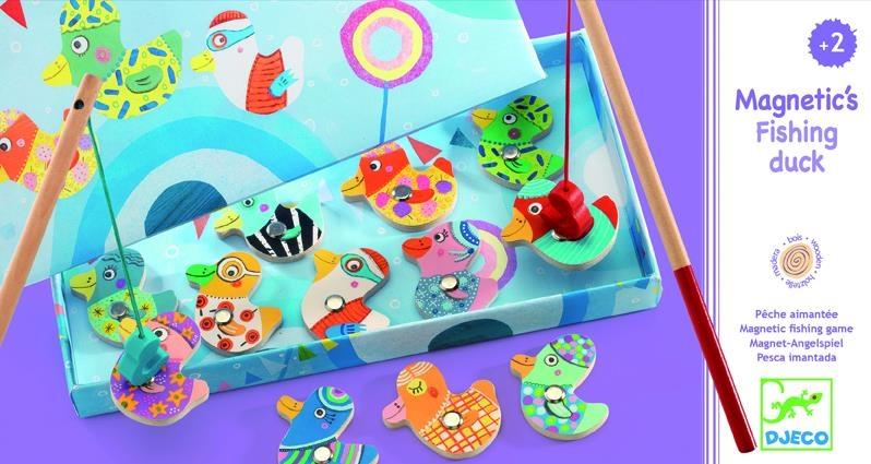 Magnetyczna gra zręcznościowa łowienie kolorowych kaczuszek to świetna zabawa dla dzieci, która rozwija zręczność i ćwiczy koordynację oko-ręka. Wiek: 2+ Materiał : drewno , karton Wymiary:28x15x2,5 cm Zestaw zawiera : -12 drewnianych kaczuszek -2 wędki z magnesem -pudełko"" staw po którym pływają kaczuszki