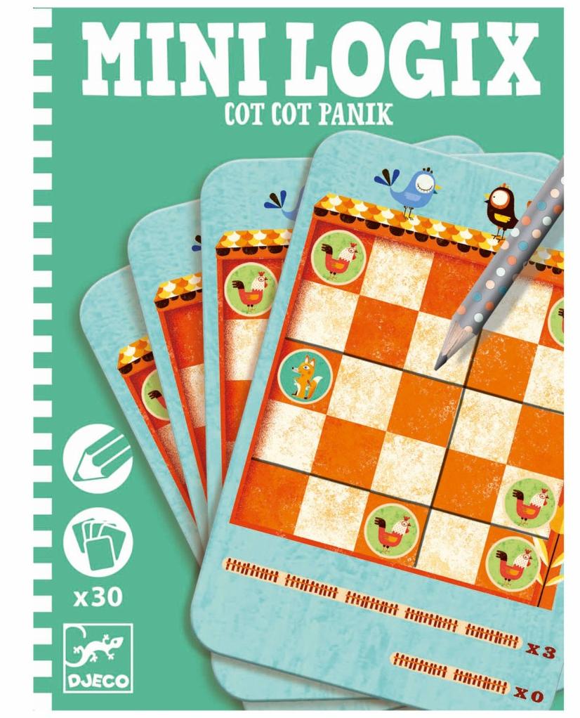 Mini Logix ""Panika w kurniku"" Nuda w czasie podróży, może popsuć najwspanialszą rodzinną wyprawę :( Djeco zadbało, aby dzieciaki w czasie podróży miały zajęcie. Mini Logix to seria poręcznych gier w formie kart idealnych na podróż . Do wyboru wiele znanych i lubianych gier. Zestaw zawiera : -30 kart -ołówek Wiek 5+