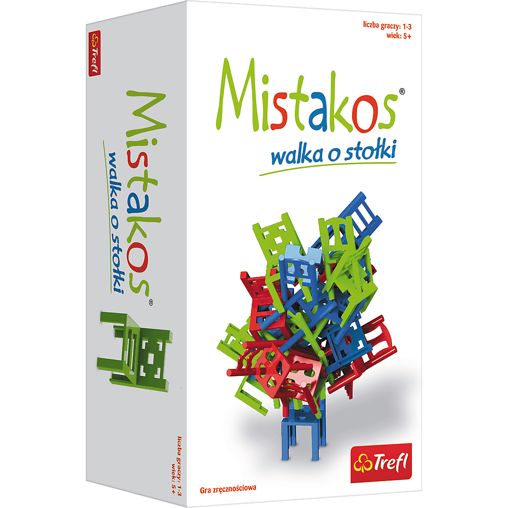 Opis produktuZasady bezpieczeństwaGra MistsakosMistakos to klasyczna gra zręcznościowa dla dzieci – i nie tylko! Walka o stołki z pewnością pochłonie również starszych graczy. Zapewnij swojej rodzinie wciągająca rozrywkę z nutką zdrowej rywalizacji!Na czym polega gra MistakosNa wielkim meblowaniu - i to dosłownie. W kartonowym opakowaniu znajdziesz zestaw 24 krzesełek w różnych kolorach: niebieskim, zielonym oraz czerwonym. Każdy gracz musi wykazać się bystrym okiem i zwinnymi palcami, by zostać mistrzem budowania wymyślnych konstrukcji. Gracz wybiera krzesło w swoim kolorze i dokłada do stosu poprzednich tak, by cała konstrukcja nie legła w gruzach. Kto pierwszy skusi, otrzyma karne punkty. Zadanie nie jest proste, ponieważ trzeba dobrze wybrać miejsce i stabilnie zahaczyć krzesło. Za nogę, oparcie, siedzisko – bez różnicy, byle zachować konstrukcję! Dwa warianty gry!Gra Mistakos może przebiegać w dwóch wariantach:Wariant 1 - Gracze jeszcze przed rozpoczęciem stawiania wieży z krzeseł, określają ilość rund do rozgrania np. 5. Zwycięża, ten, który na swoim koncie ma najmniej punktów karnych. Liczba punktów ujemnych odpowiada liczbie krzeseł, które spadły na stół w czasie ruchu danego gracza. Dla kogo?Wiek: 5+Liczba graczy: 1-3 Reklama TV Gry MistakosRecenzje:✖ Opinia niepotwierdzona zakupem