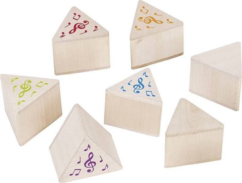 Zestaw 12 klocków oznaczonych kolorowymi nutkami.