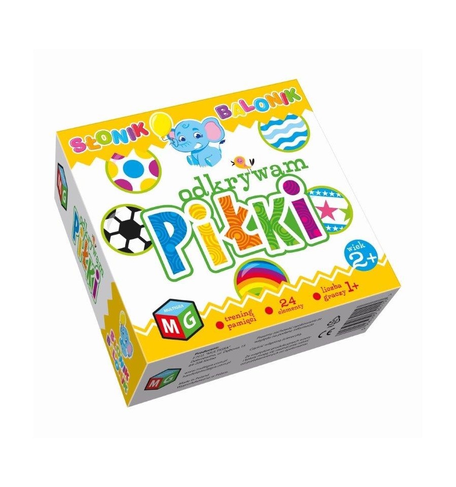 Opis produktuZasady bezpieczeństwaSłonik Balonik wychodzi naprzeciw potrzebom najmłodszych. Dzięki zastosowaniu dużych elementów z wysokiej jakości grubej tektury, dzieci z łatwością je chwytają, ćwicząc małą motorykę. Kolorowe obrazki rozbudzają w maluchach wyobraźnię, a zróżnicowane zadania świetnie wpływają na ich rozwój. ODKRYWAM PIŁKI to przyjemna gra dla maluchów i ich rodziców. Odkrywaj po 2 elementy i znajdź te, które idealnie do siebie pasują. Zapamiętuj kolory i zbierz wszystkie pary. Proste i miłe dla oka ilustracje ułatwiają dziecku poznawanie piłek i odróżnianie ich od siebie. Gra ćwiczy pamięć oraz jest doskonałym treningiem koncentracji. Okrągły kształt elementów i gruba tektura sprawiają, że zabawka jest odpowiednia nawet dla małych dzieci. Zestaw zawiera: