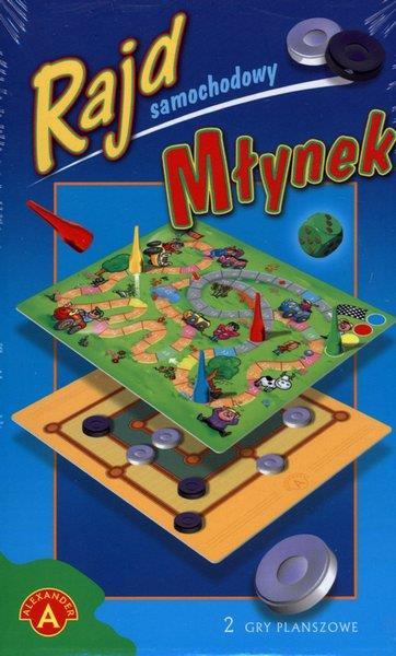 Rajd samochodowy"" to gra planszowa, w której wygrywa ten, kto pierwszy znajdzie się na ostatnim polu toru gry. Gracze starając się wyrzucić jak największą liczbę oczek kostką, przesuwają swe pionki po torze, na którym czyhają na nich przykre lub miłe niespodzianki. W ""Rajdzie samochodowym"" może zdarzyć się nieszczęśliwy wypadek, awaria silnika lub przyspieszenie na prostej drodze. Wszystko to zapewnia wysoki poziom emocji i atrakcyjność gry. ""Młynek"" - to jedna z najstarszych gier. Wymaga od uczestników intensywnego myślenia wyobraźni. Zwycięzcą zostanie w tej grze ten, kto lepiej przewidzi kolejne posunięcia i będzie miał lepszą strategię. Gra dla 2-4 graczy w wieku od 5 lat.