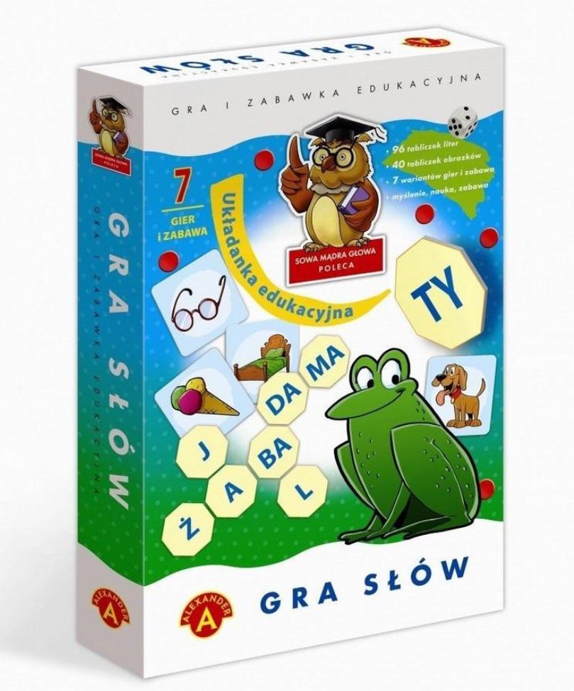 "Gra słów" to zestaw gier słownych i zabawa dla dzieci poznających litery. W zabawie dla najmłodszych, dzieci układają litery do wybranego obrazka, tak by utworzyć jego nazwę. Gry z udziałem liter i obrazków są dla dzieci treningiem spostrzegawczości, koncentracji i refleksu. Gry z tabliczkami literowymi i kostką, to gry słowne dla starszych dzieci i dorosłych. Ta grupa gier, to emocjonująca zabawa, w której gracze wzbogacają swoje słownictwo, doskonalą umiejętności poprawnej pisowni, ćwiczą koncentrację i myślenie. Zawartość pudełka: 96 tabliczek z literami, 40 tabliczek z obrazkami, kostka, 40 żetonów, worek, instrukcja.