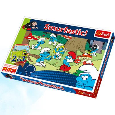 Smurfastic!Zapowiada się Smerfastyczna zabawa! Smerfy postanowiły skorzystać ze wspaniałej pogody i urządziły sobie piknik na leśnej polanie. Niestety, Gargamel dowiedział się o ich planach i postanowił zrobić im niemiłą niespodziankę! Bądź najsprytniejszym Smerfem, nie daj złapać się w pułapkę i zostań bohaterem uwalniając swoich przyjaciół!A może wolisz zabawy w wodzie? Odwróć planszę i dołącz do Smerfów relaksujących się nad błękitnym stawem! Zagraj z przyjaciółmi w jedną z wielu ulubionych smerfnych zabaw.Zawartość pudełka: dwustronna plansza do gry 13 pionków Smerfów 13 plastikowych podstawek 9 kafelków z przeszkodami 49 żetony kamieni / zaczarowanych symboli instrukcja