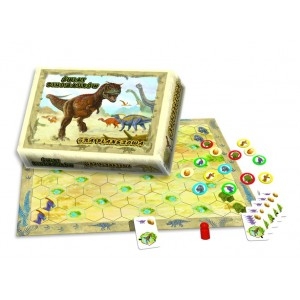 AXEL - świat puzzli i gier dla dzieci i dorosłych.Wkrocz w pełen niebezpieczeństw prehistoryczny świat dinozaurów!W tej pasjonującej grze, gracz prowadzi i rozwija swoje stado pradawnych gadów, musi zadbać o dostęp do bezcennych źródeł życia, czyli wodopojów. Dinozaury należy rozmieszczać na planszy tak, aby tworzyły stada, nowe dinozaury wykluwają się z jaj, a starsze zajmują kolejne tereny dla twojej gromady. Niestety pradawna ziemia była pełna zagrożeń a największym dla dinozaurów były olbrzymie drapieżne Tyranozaury! Po planszy porusza się właśnie taki przerażający gad poluje na mniejsze bezbronne osobniki, musisz się strzec spotkania z nim gdyż Twoje stado może się rozproszyć po ataku Tyranozaura, a twój trud budowy stada i zajęcia źródeł pójdzie na marne.W grze zwycięża gracz, który zajmie największą liczbę jezior i zgromadzi największe stado. Elementy: plansza, pion Tyranozaura, 96 żetonów dinozaurów, 22 karty Czas gry: 30 minut Wiek: 6-99 Ilość graczy: 2-4