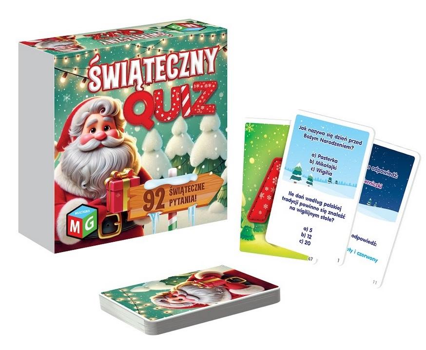 Opis produktuZasady bezpieczeństwaRodzinny Świąteczny Quiz zabawa pełna radości na czas Bożego Narodzenia! Rodzinny Świąteczny Quiz to fantastyczny sposób, aby spędzić wyjątkowe chwile w gronie najbliższych, łącząc zabawę z nauką o tradycjach bożonarodzeniowych! Gra pozwoli sprawdzić swoją wiedzę o świątecznych zwyczajach, a jednocześnie dowiedzieć się ciekawostek o tym wyjątkowym okresie. W quizie znajdziecie pytania o imię najsłynniejszego renifera, świąteczne zwyczaje w innych zakątkach świata oraz znane świąteczne przysmaki. Kto w rodzinie wykaże się największą wiedzą i zdobędzie tytuł eksperta od Świąt? Rodzinny quiz świąteczny zapewnia świetną zabawę dla wszystkich pytania są zróżnicowane, więc każdy, od najmłodszych po dorosłych, będzie się doskonale bawił. To idealna propozycja na wspólną rozrywkę w czasie Świąt oraz świetny pomysł na prezent pod choinkę czy na Mikołajki. Zawartość opakowania: