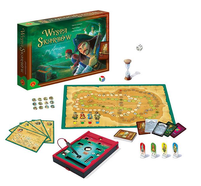 Wyspa skarbów- gracze wcielają się w postacie dowódców morskich wypraw. Otrzymali oni wiadomość o ukrytym przez piratów od dawna skarbie na jednej z wysp karaibskich i ruszają w podróż, by zdobyć legendarne bogactwo. Wygrywa ten kto jako pierwszy pokona wszystkie przeszkody i znajdzie ukryty skarb. Gra zawiera między innymi planszę, po której gracze się poruszają, karty ""losu"" , karty ""zdobyczy"", klepsydrę, 2 kostki oraz część elektroniczną, z której na czas za pomocą pęsety trzeba wydobyć przedmioty potrzebne do odkrycia skarbu. Gra dla graczy w wieku powyżej 7 lat.
