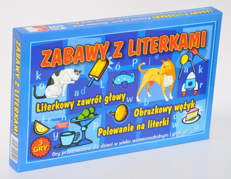 W skład zestawu wchodzą : - Literkowy zawrót głowy - Obrazkowy wężyk - Polowanie na literki. Gry łączą elementy zabawy z nauką. Podczas gry dziecko utrwala znajomość liter, rozwija pamięć oraz doskonali umiejętność analizy i syntezy wzrokowo-słuchowej.