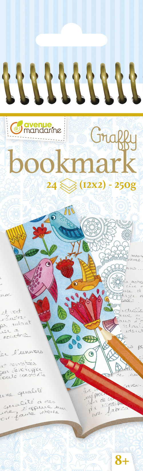 24 zakładek do samodzielnego udekorowania (kredkami, flamastrami, akwarelą, brokatem…)Jednostronny nadruk, papier 250g - 12 motywów po 2 szt każdy. Zakładki z perforacją umożliwiającą ich oderwanie.