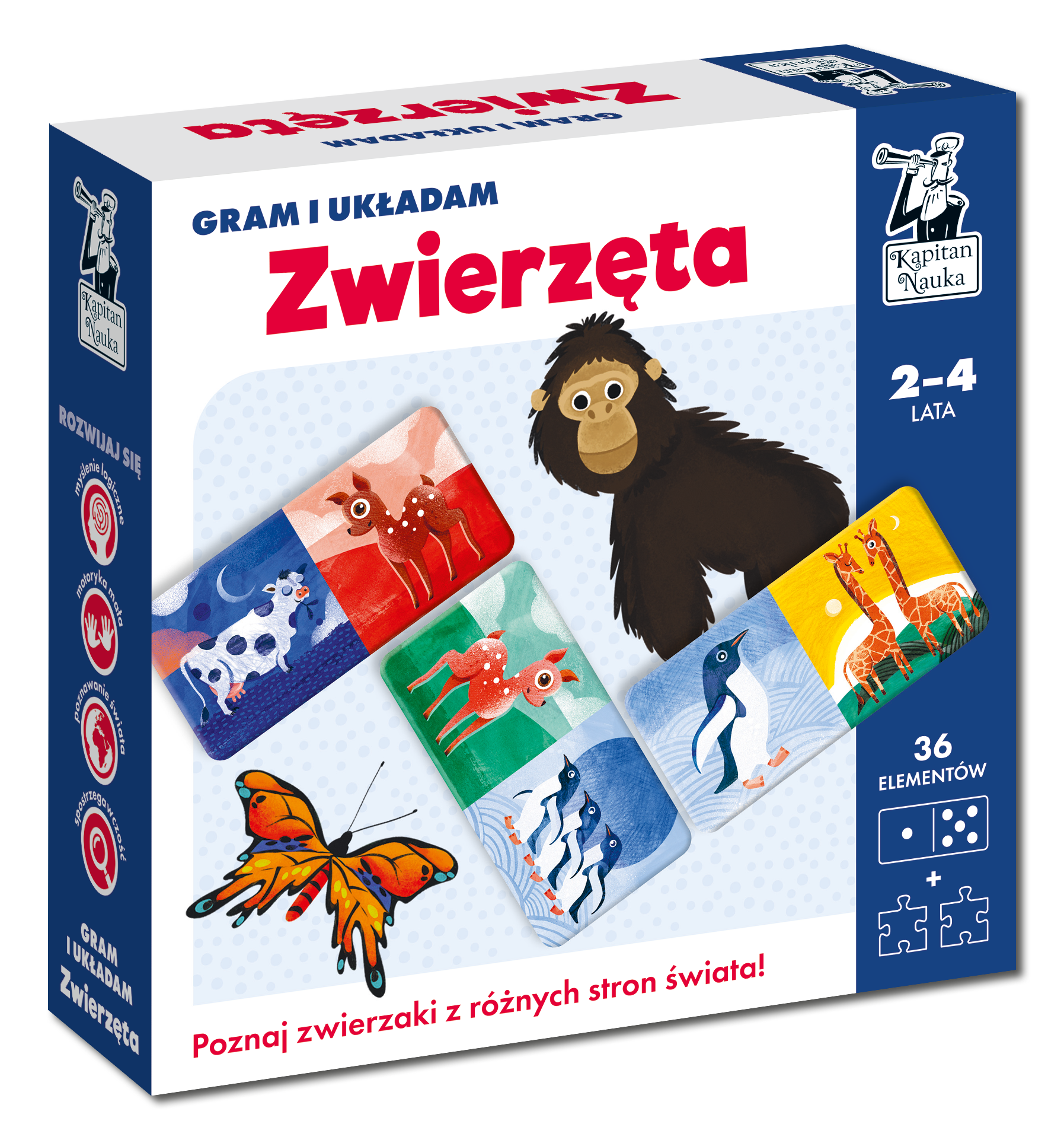 Opis produktuZasady bezpieczeństwa"Gram i układam Zwierzęta" (18 msc - 4 lata) to zestaw z układankami i domino dla młodszych dzieci. Łączy je atrakcyjna tematyka - zwierzęta z rzeczywistości i wyobraźni, przedstawione z niezwykłym humorem i wrażliwością. Celem zabawy jest dopasowanie do siebie puzzli i kafelków ze zwierzętami, które ukrywają się wśród roślin lub szukają pary do wspólnych aktywności. Zwierzęta nie są jednak identyczne, gra wymaga więc bystrego oka i koncentracji podczas rozpoznawania zwierząt. Dzięki temu mali gracze trenują m.in. myślenie logiczne oraz spostrzegawczość. Trening myślenia logicznego i spostrzegawczości Po czym poznać tukana? Co odróżnia bajkowego konia od prawdziwego? Gdzie mieszkają pingwiny i jak śpią żyrafy? Pakiet "Gram i układam Zwierzęta" (18 msc - 4 lata) wspiera rozwój myślenia logicznego przez zabawę. Dziecko ma okazję przyjrzeć się różnym zwierzętom, m.in.: wiewiórkom, które postanowiły podzielić się orzeszkiem, leniwcom zwisającym leniwie z drzew oraz słoniom schładzającym się wodą z trąby. Dzięki różnicom w przedstawieniu tych samych zwierząt młodsze dzieci będą miały okazję ćwiczyć rozpoznawanie i klasyfikowanie obiektów. Układankami i domino można bawić się w pojedynkę lub z innymi graczami, wówczas kafelki losuje się i układa naprzemiennie. Barwne ilustracje Joanny Gwis i Katarzyny Nowowiejskiej wprowadzają dzieci w świat zwierząt ukazanych w zabawny i fascynujący sposób, zachęcając do gry i angażując uwagę. Kafelki do gry zostały wykonane z grubej tektury, co gwarantuje bezpieczną zabawę oraz wytrzymałość nawet podczas najbardziej emocjonujących rozgrywek. Rozwój poznawanie świata, myślenie logiczne, spostrzegawczość, motoryka mała W serii również