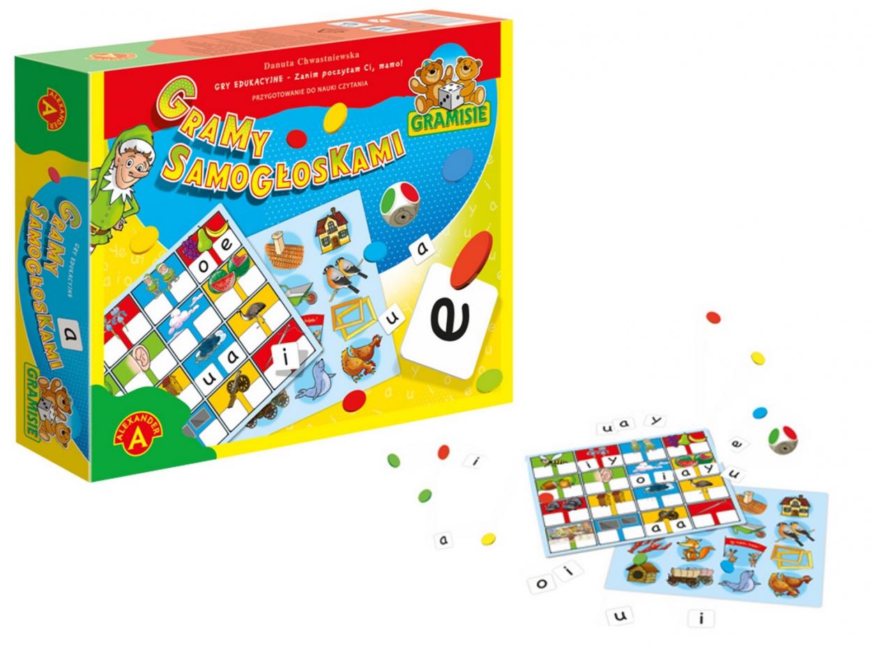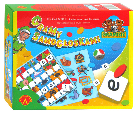 "Zagramy samogłoskami" składa się z 2 zabaw i 5 gier, które odnoszą się do słuchowego wyodrębniania samogłosek na początku i na końcu wyrazu. Dzięki nim możemy wyćwiczyć z dzieckiem umiejętność łączenia dźwięku samogłoski z jej literowym odpowiednikiem.