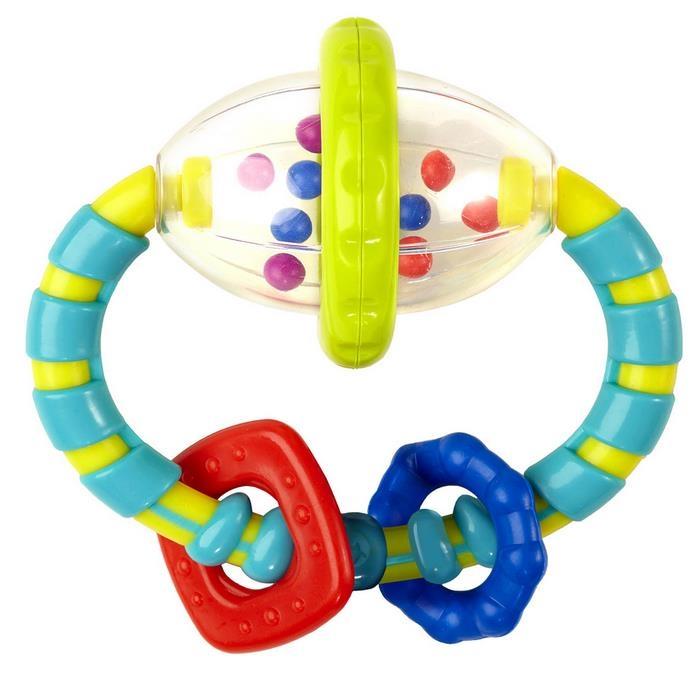 Zabawka składa się z trzech części. Pierwsza z nich to obrotowa grzechotka z kolorowymi koralikami. Druga część to dwa koraliki o wesołych kształtach, wypukłych wzorach oraz zróżnicowanej strukturze powierzchni, doskonałej dla ząbkującego maluszka. Trzecia część to wykonana ze specjalnego tworzywa, łatwa do chwytania obręcz, która dzięki swojej strukturze nie wyślizguje się z rączek, a także stanowi dodatkową atrakcję poznawczą dla dziecka.