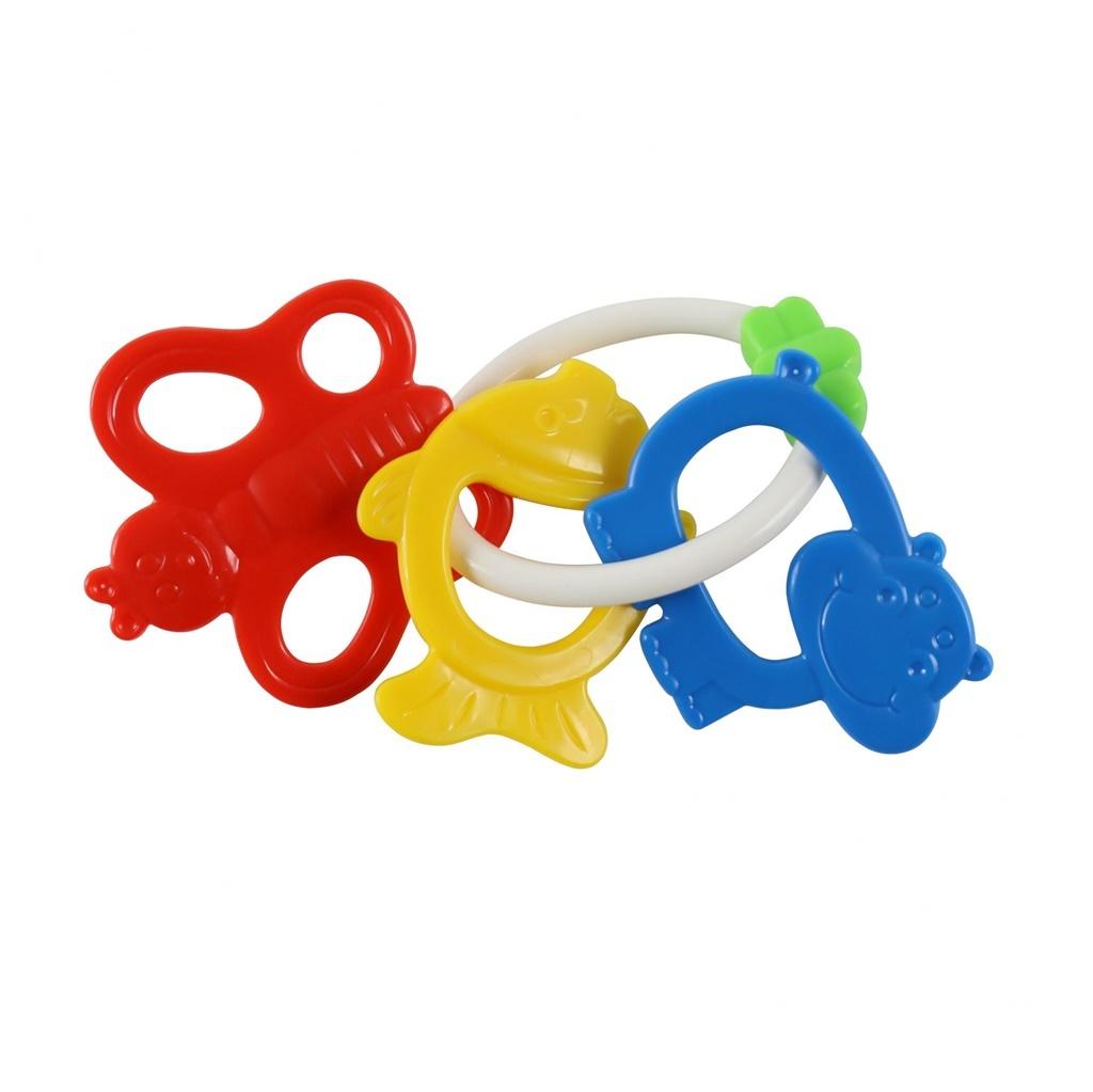Grzechotka o kształtach kółka z rybką, motyłem i begemotem. Najlepsza zabawka dla niemowląt. Wiek 0+