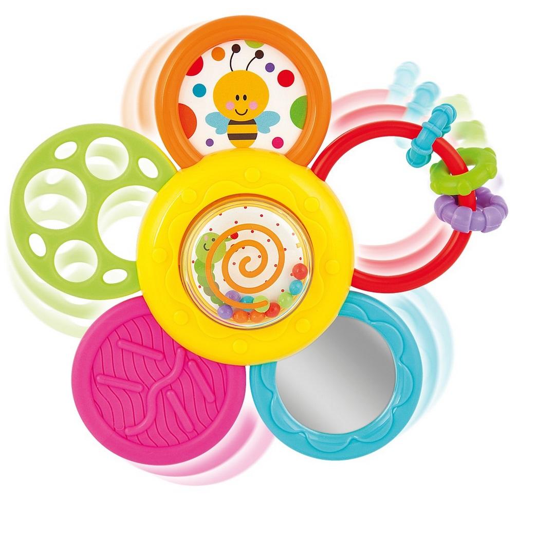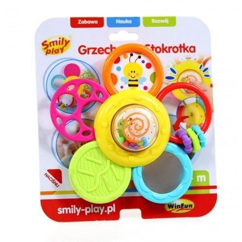 Ta zabawka ma wiele elementów: grzechotkę, gryzak, bezpieczne lusterko oraz piszczałkę. Przymocuj grzechotkę do gładkiej powierzchni. Dziecko może obracać stokrotkę, ćwicząc małe paluszki. Miękkie gryzaki ukoją dziąsła dziecka. Kolorowe, ruszające się elementy aktywizują dziecko i wspierają rozwój percepcji oraz małej motoryki.