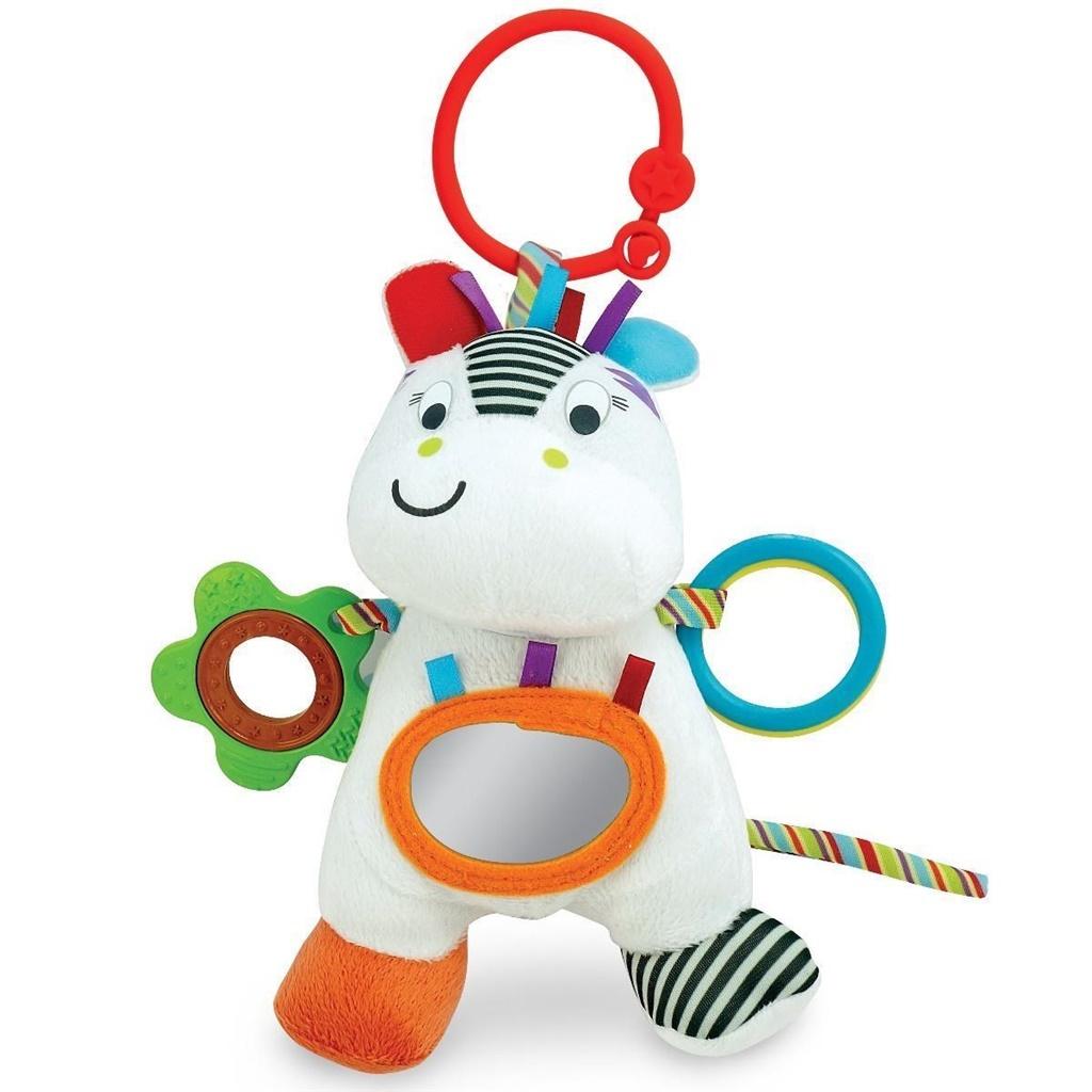 Zebra wykonana z bardzo przyjemnych w dotyku materiałów. Posiada duży uchwyt, służący do zawieszenia. Dziecko, potrząsając zabawką, usłyszy delikatny odgłos dzwoneczka.
