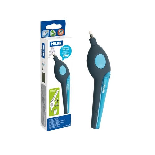 Gumka elektryczna w ergonomicznym kształcie z zestawem: 7 wymiennych gumek plastikowych do grafitu, 4 wymiennych gumek do atramentu oraz 2 bateriami AAA 1,5V. Sposób użycia: naciśnij przycisk i przyłóż delikatnie do powierzchni, którą chcesz wytrzeć. Zbyt mocny nacisk spowoduje zatrzymanie gumki.