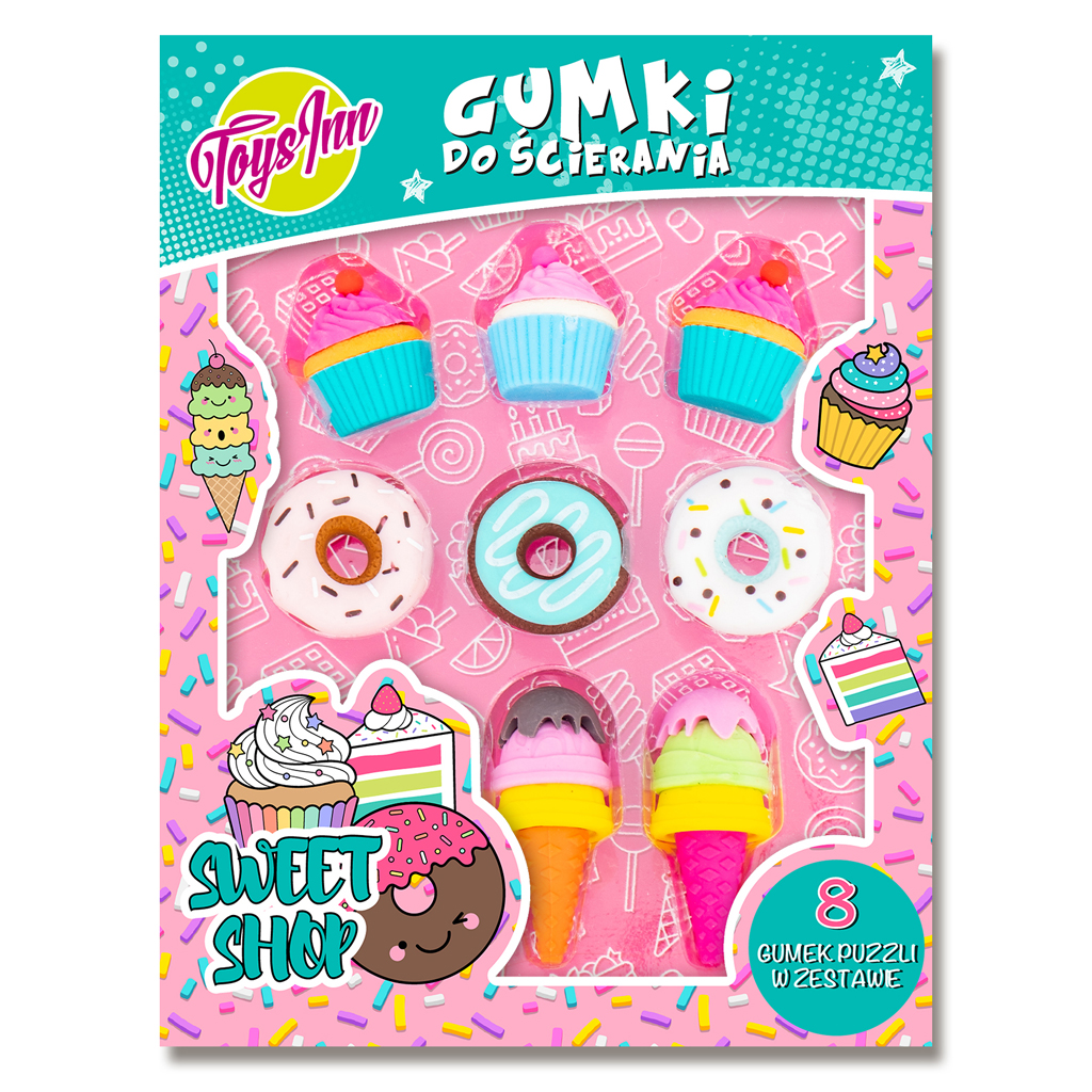 Gumki do ścierania Sweet Shop to zestaw 8 gumek puzzli. Kolekcjonuj i wymieniaj się z przyjaciółmi! Dostępne są trzy zestawy. W zestawach znajdziesz gumki puzzle w kształcie jednorożców, donutów czy lodów. Gumki puzzle to super zabawa!