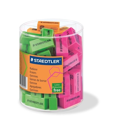 Precyzyjnie ściera grafit zarówno z papieru jak i matowej folii kreślarskiej, praktycznie nie pozostawia śladów grafitu, nie niszczy ścieranej powierzchni, owinięta jest w celofan, dzięki czemu nie wysycha. Wymiary gumki: 11,5 x 18 x 35 mm (szer x gł x wys). Gumka w trzech żywych neonowych kolorach: różowym, pomarańczowym lub zielonym. 60sztuk w plastikowej tubie.