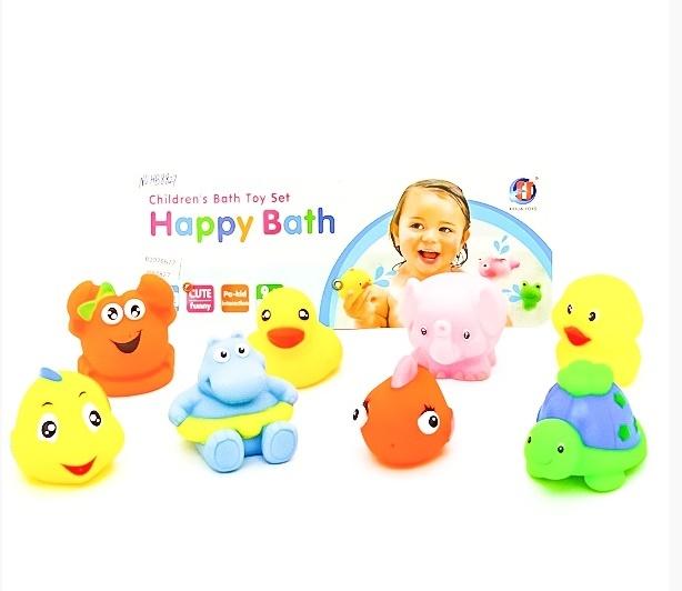 Zestaw ośmiu gumowych zwierzątek do zabawy w kąpieli.
