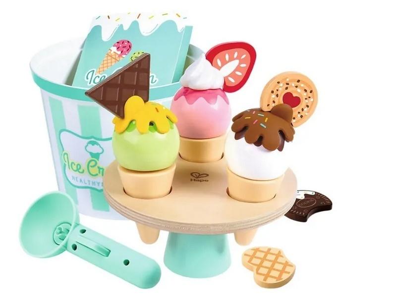Realistyczne elementy jak gałkownica, różnorodne smaki lodów i dodatki, które można dowolnie łączyć. Całość wykonana z wysokiej jakości drewna i bezpiecznych materiałów.