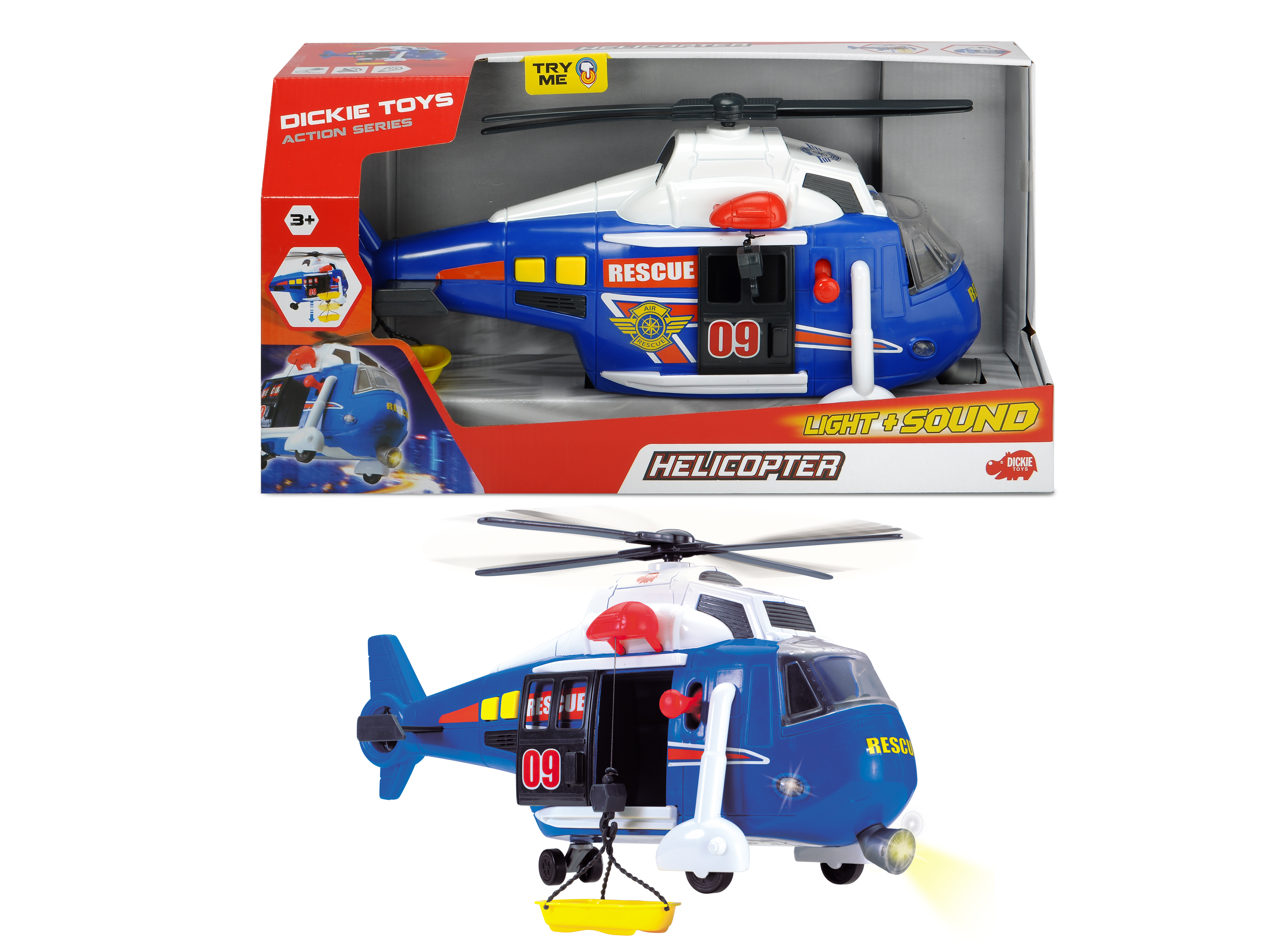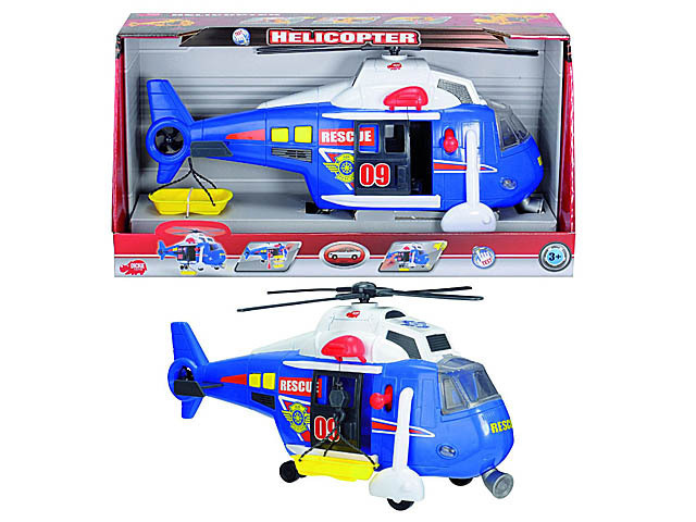 Niebieski Helikopter na baterie, emituje światło, wydaje dźwięki. Śmigłowiec wyposażony jest we wyciągarkę i otwierane drzwi. Produkt przeznaczony: dla dzieci powyżej 3 lat