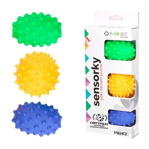 Zestaw zawiera trzy piłeczki sensoryczne w różnych rozmiarach i z różnymi wypustkami.