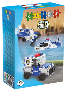 Zestaw klocków do ułożenia pojazdów policyjnych.