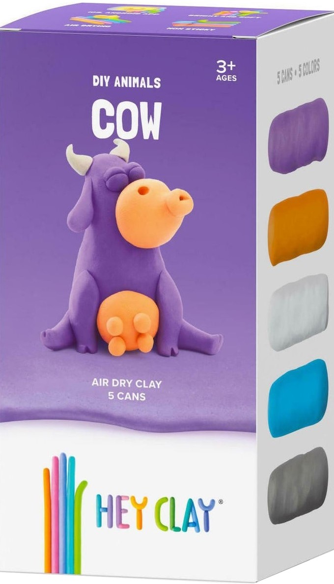 Jesteśmy pewni, że z wielką przyjemnością ulepisz krowę. Gdy tylko spojrzysz w jej urocze oczy wykonane z masy plastycznej, zakochasz się od pierwszego wejrzenia! Aby ulepić krowę potrzebujesz pięciu kolorów masy: fioletowej, jasnobrązowej, białej, szarej i niebieskiej.