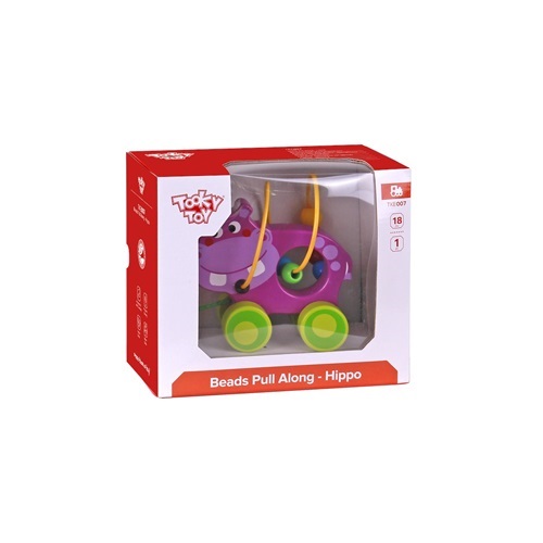 Drewniany Hipopotam ma kółka i sznureczek do ciągnięcia. Dziecko, które opanowało zdolność samodzielnego chodzenia może zabrać Hipcia na spacer.