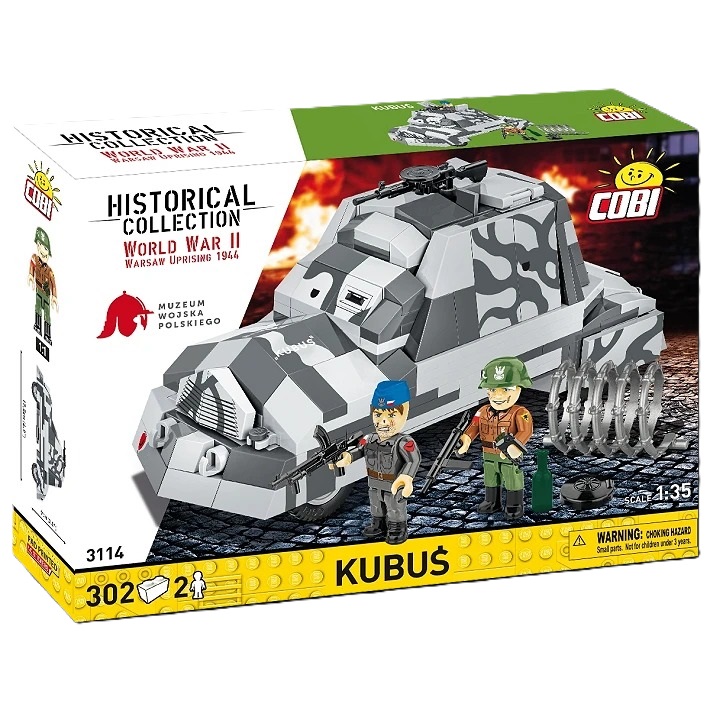Opis produktuZasady bezpieczeństwaCobi-3114 KUBUŚ HISTORICAL COLLECTION WORLD WAR II 302 klocków 2 figurkI Grupa wiekowa 7+ Skala 1:35 Kubuś to polski improwizowany samochód pancerny, który został zbudowany przez powstańców warszawskich w sierpniu 1944 roku podczas Powstania Warszawskiego. Pojazd ten powstał w zaledwie kilka dni, w warsztacie przy ul. Tamka. Do jego budowy wykorzystano podwozie ciężarówki Chevrolet 157 oraz blachy stalowe, które miały chronić załogę przed ogniem nieprzyjaciela. Kubuś, uzbrojony w karabiny maszynowe, brał udział w kilku akcjach bojowych, w tym w nieudanym ataku na Uniwersytet Warszawski. Po zakończeniu powstania Kubuś cudem przetrwał wojnę i obecnie jest eksponowany w Muzeum Wojska Polskiego w Warszawie jako symbol odwagi i pomysłowości powstańców warszawskich! Razem z Muzeum Wojska Polskiego postanowiliśmy uczcić 80. rocznicę wybuchu Powstania Warszawskiego! Przygotowaliśmy wyjątkowy klockowy zestaw z legendarnym samochodem powstańczym "Kubuś"! Klockowy model w skali 1:35 zawiera nadruki oraz wszystkie najważniejsze cechy swojego pierwowzoru znajdującego się w Muzeum Wojska Polskiego w Warszawie. Nie zapomnieliśmy nawet o tak mało znanym detalu, jak emblemat Kolumny Motorowej Wydra, który znajdował się na zderzaku! Nasz model został wyposażony w karabin maszynowy DP-28. Górny właz można otworzyć, aby umieścić w nim figurkę. Nie każdy wie, że do Kubusia wsiadało się przez otwór w podłodze! Zaznaczyliśmy w modelu to nietypowe wejście! Do zestawu dołączone są dwie figurki przedstawiające powstańców warszawskich. W szarym kombinezonie, z biało-czerwoną opaską na prawym ramieniu, z naszywką "Wydry" na lewym i niebieskiej furażerce przedstawiliśmy żołnierza z Kolumny Motorowej Wydra, która była częścią Zgrupowania Krybar. Drugi z żołnierzy należy do plutonu "Rafałki". To, co ich wyróżniało spośród innych formacji to używanie jako emblematów niemieckich saperskich żółtych trójkątnych proporczyków z trupią czaszką, które stanowiły oznaczenie dla terenu zaminowanego bądź skażonego chemicznie. Symbol ten znajduje się na lewym ramieniu żołnierza. Na hełmie z boku białą farbą namalowana jest litera "R" charakterystyczna dla tej formacji. Obie figurki zostały wyposażone w akcesoria takie jak: pistolet maszynowy STEN, ręczny karabin maszynowy Bren, granat ręczny i minę. W zestawie znajduje się również butelka oraz fragment drutu kolczastego. Powstanie warszawskie wybuchło 1 sierpnia 1944 roku i trwało aż do 3 października. Było zbrojnym wystąpieniem polskiego ruchu oporu, głównie Armii Krajowej, przeciwko okupującym Warszawę wojskom niemieckim. Celem powstania było wyzwolenie stolicy przed nadejściem Armii Czerwonej, aby zapewnić suwerenność Polski po wojnie. Mimo początkowych sukcesów, powstańcy nie zdołali utrzymać swoich pozycji w obliczu przeważających sił niemieckich i braku dostatecznej pomocy z zewnątrz. Po 63 dniach zaciętych walk powstanie zostało stłumione. Zginęło około 16 tysięcy powstańców i około 150-200 tysięcy cywilów, a miasto zostało niemal doszczętnie zniszczone. Powstanie warszawskie pozostaje symbolem polskiego heroizmu i patriotyzmu. 302 wysokiej jakości elementy wyprodukowane w UE przez firmę z ponad 20-letnią tradycją, spełniają normy bezpieczeństwa dotyczące produktów dla dzieci, w pełni kompatybilne z innymi markami klocków konstrukcyjnych, klocki z nadrukami nie odkształcają się i nie bledną w czasie zabawy czy pod wpływem temperatury, model czołgu, dwie figurki, akcesoria, Wymiary modelu (dł x wys): 17,5 cm (6.9") x 9 cm (3.5") x