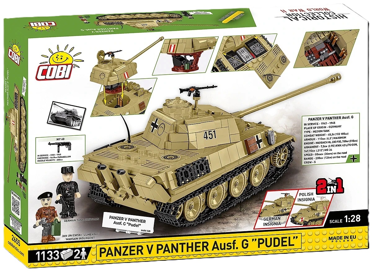 Opis produktuZasady bezpieczeństwaCOBI-2655 PANZER V PANTHER AUSF.G "PUDEL" HISTORICAL COLLECTION 1133 elementy Grupa wiekowa: 10+ Skala: 1:28 Zbuduj Panzer V PANTHER Ausf.G "Pudel" od COBI krok po kroku i poczuj, jak ten legendarny pojazd ożywa w Twoich rękach! Konstruując ten czołg, stworzysz imponujący model, który zachwyci każdego miłośnika klocków, kolekcjonera i pasjonata historii. Panzer V PANTHER Ausf.G to jeden z najważniejszych niemieckich czołgów II wojny światowej, a jego wersja "Pudel" zyskała szczególne znaczenie w historii Polski, kiedy to czołg został zdobyty przez powstańców warszawskich w sierpniu 1944 roku. Interaktywna zabawa i realizm - Model wyposażony jest w ruchome działo, otwieraną klapę oraz obrotową i wyjmowaną wieżę czołgową, co zapewnia wyjątkowy realizm i umożliwia kreatywną zabawę. Realistyczna konstrukcja - W zestawie znajdziemy wyjmowany silnik Maybach HL-230, który można wyeksponować obok model Precyzyjne detale historyczne - Zestaw zawiera szczegółowe odwzorowanie karabinów maszynowych oraz gąsienic, które są inspirowane autentycznym sprzętem z II wojny światowej, co czyni model wyjątkowo realistycznym. Kolekcjonerski wymiar - Dwie figurki - niemieckiego czołgisty oraz Polaka Jana Uniewskiego ps. "Lumeński" - który uruchomił zdobyczny czołg w czasie Powstania Warszawskiego, dodają wyjątkowego kontekstu historycznego. Przydomek "Pudel" - Czołg go otrzymał na cześć oficera Tadeusza Tyczyńskiego, który zginął podczas walk, a model oddaje hołd tym, którzy walczyli o wolność Polski. Łatwy i satysfakcjonujący proces budowy - Dzięki szczegółowej instrukcji budowa czołgu jest prosta i przyjemna, a wysokiej jakości klocki COBI gwarantują precyzyjne dopasowanie i trwałość modelu. Kreatywność i satysfakcja - Doskonale wyprofilowane elementy sprawiają, że łączenie klocków jest łatwe i przyjemne, a efekt końcowy daje ogromną satysfakcję z wykonania precyzyjnego, historycznego modelu. Emblematy narodowe - Model posiada emblematy narodowe Polski, takie jak symbol Polski Walczącej i lilia harcerska. Możliwość wymiany na emblematy niemieckie daje Ci pełną swobodę w dostosowywaniu modelu. Rozbudowa kolekcji - Sprawdź inne pojazdy z serii HISTORICAL COLLECTION World War II i stwórz własną, unikalną kolekcję historycznych maszyn! Panzer V PANTHER Ausf.G "Pudel" to idealna okazja, by zbudować jeden z najbardziej znanych pojazdów wojskowych w historii Powstania Warszawskiego, zgłębiając przy tym fascynujące tajemnice przeszłości. Zestaw to także świetny wybór dla dorosłych kolekcjonerów, którzy docenią wysoką jakość i dbałość o detale. 1133 wysokiej jakości elementy, Wyprodukowane w UE przez firmę z ponad 35-letnią tradycją, Spełniają normy bezpieczeństwa dotyczące produktów dla dzieci, W pełni kompatybilne z innymi markami klocków konstrukcyjnych, Czytelna i intuicyjna instrukcja oparta na rysunkach i ikonach, Wymiary modelu: 32 12 12 cm Wymiary pudełka: 45 7 30,5 cm x