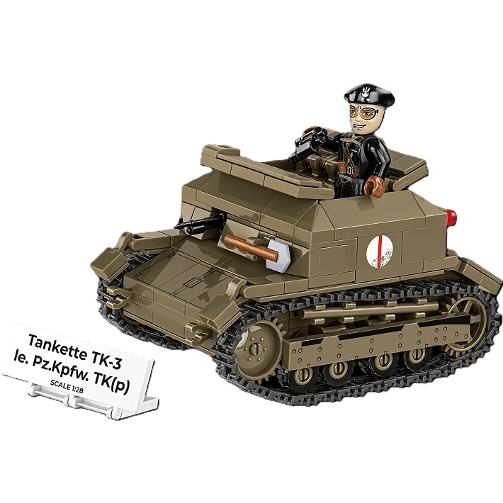 Opis produktuZasady bezpieczeństwaTankietka TK-3 to lekki polski pojazd opancerzony z okresu międzywojennego, produkowany na licencji brytyjskiego Vickers Carden-Loyd Mk VI. Była to jedna z podstawowych tankietek Wojska Polskiego w latach 30. XX wieku i brała udział w kampanii wrześniowej 1939 roku. Charakterystyka TK-3: Nadwozie i konstrukcja: Dwuosobowa tankietka - załogę stanowił kierowca i strzelec. Napęd na gąsienice, oparty na podwoziu Vickersa. Pancerz: 3-8 mm, odporny na broń strzelecką, ale łatwy do przebicia przez broń przeciwpancerną. Brak wieży obrotowej - broń zamontowana w przedniej płycie kadłuba. Uzbrojenie: Karabin maszynowy wz. 25 Hotchkiss (7,92 mm) (pierwsze wersje) lub wz. 30 Browning. Brak działa przeciwpancernego - co było główną wadą w starciu z czołgami wroga. Napęd i osiągi: Silnik Fiat 122AC o mocy 40 KM. Prędkość maksymalna: 46 km/h (bardzo szybka jak na swoje czasy). Zasięg: ok. 200 km na drodze utwardzonej. Zastosowanie bojowe Rola: rozpoznanie, wsparcie piechoty, działania osłonowe. Użycie: kampania wrześniowa 1939 - walczyły w bitwie nad Bzurą i obronie Warszawy. Zalety: zwrotność, łatwość transportu, niskie zużycie paliwa. Wady: słabe opancerzenie, brak uzbrojenia przeciwpancernego. x