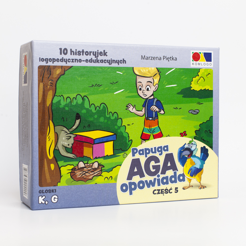 Papuga Aga opowiada. Część 5 k, ki, g, gi to zestaw 10 historyjek obrazkowych 4-elementowych, które można wykorzystać w terapii logopedycznej i zabawach ogólnorozwojowych dzieci w wieku przedszkolnym i wczesnoszkolnym.