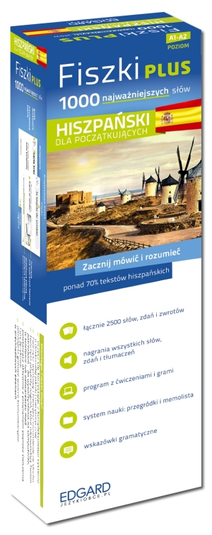 Opis produktuZasady bezpieczeństwaZawartość: 1000 fiszek- uczysz się, korzystając z kompleksowego systemu o doskonałej jakości merytorycznej- ćwiczysz wymowę i trenujesz rozumienie ze słuchu tworzysz playlisty nagrań, które odpowiadają Twoim potrzebom - do wykorzystania na komputerze, w telefonie lub odtwarzaczu mp3- powtarzasz aktywnie z programem poprzez ?wiczenia i gry językowe- poznajesz gotowe wzorce komunikacyjne w przykładowych zdaniachCzy wiesz, ze 1000 słów wystarczy, by czytać ze zrozumieniem 70% tekstów użytkowych w języku obcym? Fiszki Plus to kompleksowy system nauki - poznasz z nim ponad 1000 najważniejszych słów, a także wzory odmian, formy nieregularne oraz poprawna wymowę. Przykładowe zdania do KAŻDEGO słówka to gotowe wzorce komunikacyjne, dzięki którym przećwiczysz ich użycie w kontekście. System Fiszki Plus pozwoli Ci szybko opanować podstawy i umożliwi swobodne porozumiewanie się w języku hiszpańskim.- Ucz się słów i przykładowych zdań - poznaj użycie słów w kontekście. Opanuj synonimy, idiomy; poznaj reguły gramatyczne.- Zapamiętuj skutecznie, wykorzystując system z kolorowymi przegródkami.- Poznaj prawidłowa wymowę. Słuchaj nagrań wszystkich słówek i zdań wraz z tłumaczeniami.- Utrwalaj materiał z ćwiczeniami i grami językowymi zawartymi w programie.- Powtarzaj słówka umieszczone na memoliście i sprawdź, co już umiesz.- Ucz się mobilnie - w drodze do pracy lub szkoły! x