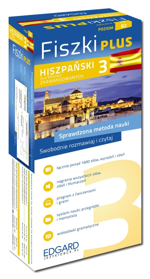 Hiszpański Fiszki PLUS dla średnio zaawansowanych 3 (B2) to pakiet 600 fiszek będący częścią rozbudowanego systemu nauki, dzięki któremu szybko i skutecznie nauczysz się słownictwa na każdym poziomie zaawansowania. Każdy zestaw Fiszek PLUS to starannie przygotowany materiał, wysokiej jakości nagrania wymowy wraz z programem komputerowym, memolistą i grami językowymi.