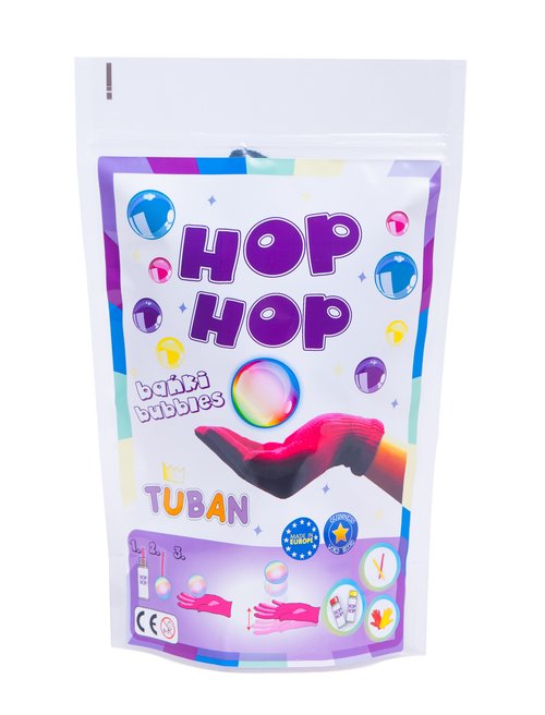HOP HOP i magia się zaczyna. TUBAN, jako specjalista w z dziedziny baniek, opracował zestaw, który umożliwia czarowanie bez znajomości magii. Wszystkie bańki pękają bezpowrotnie, czy aby na pewno... Nasz HOP HOP wydłuża bańkowe czary – teraz możesz złapać bańkę do ręki, obrócić ją, zgnieść, zakręcić, podpić a nawet nią żonglować. Wspaniałe – nieprawdaż? Wszystko dzięki magicznej rękawiczce oraz niezbędnym TUBANowym akcesoriom.