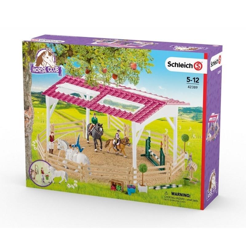 Szkółka jeździecka to okazały zestaw z figurkami jeźdźców, końmi i trenerką oraz sporą ilością dodatkowych elementów, stanowiących niezbędne wyposażenie. Zadaszony i ogrodzony wybieg to miejsce do ćwiczeń jazdy konnej, skoków przez przeszkody i woltyżerki. x