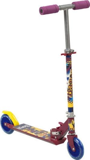 Hulajnoga 2-kołowa FC Barcelona -dla fanów hiszpańskiej drużyny. Materiał: Aluminium-metal. Posiada system szybkiego składania, regulację wysokości kierownicy, oraz hamulec tylnego koła. Koła w rozmiarze 125mm wykonane są z PCV i posiadają łożyska ABEC-3 Hulajnoga przeznaczona jest dla użytkowników o wadze max. 50 kg Produkt wyprodukowany zgodnie z normą EN71 1-3