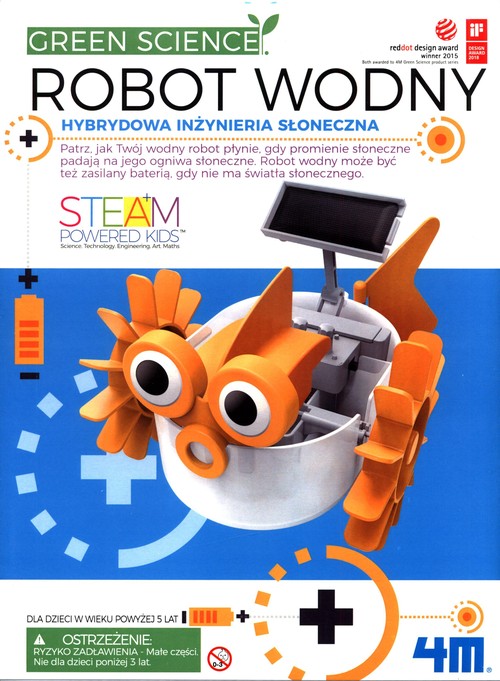 Poznaj tajniki hybrydowej inżynierii słonecznej. Zbuduj własnego robota wodnego z hybrydowym zasilaniem. Gdy padają na niego promienie słoneczne, porusza się dzięki panelowi solarnemu. A gdy zabraknie Słońca? Przełącz robota wodnego na zasilanie bateryjne i baw się dalej!