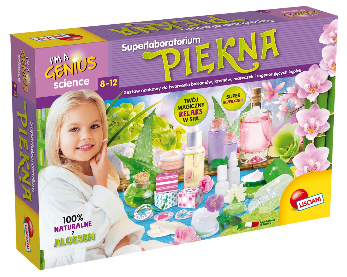 Bogaty zestaw edukacyjny z fioletowej serii I'm a genius skierowanej głównie do dziewczynek. Dzięki temu produktowi, dziewczynki mogą poczuć się jak w prawdziwym SPA, odtwarzając magiczną i relaksującą atmosferę wytwarzając kosmetyki na bazie aloesu, które są w 100% bezpieczne.