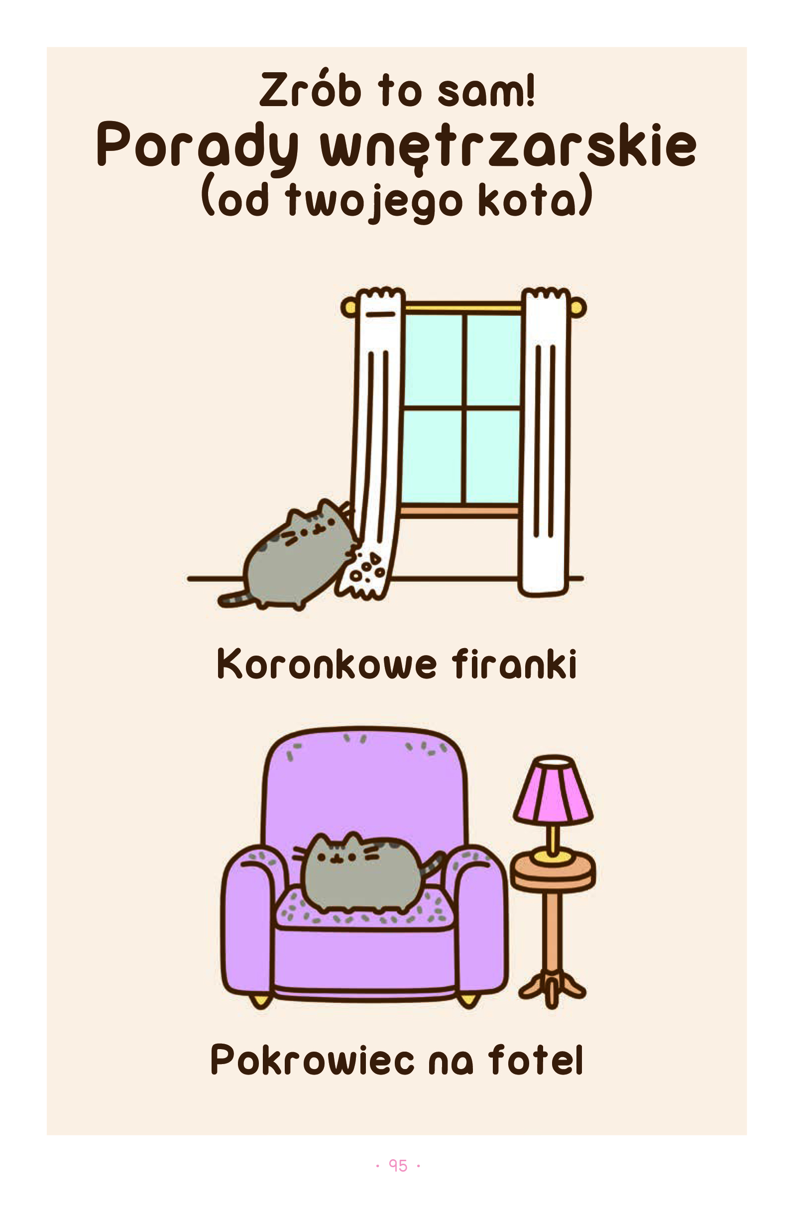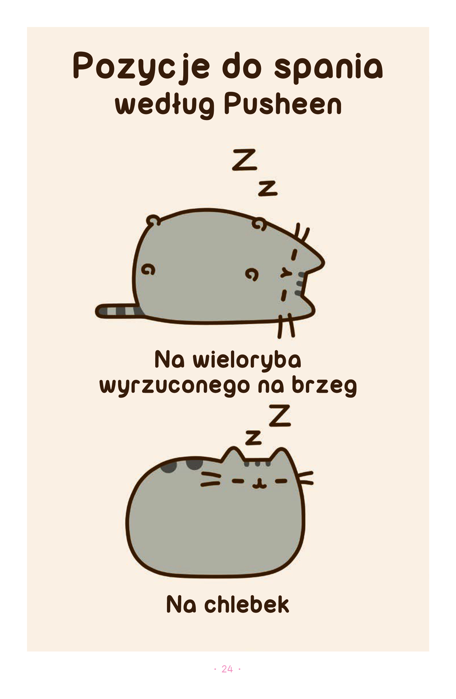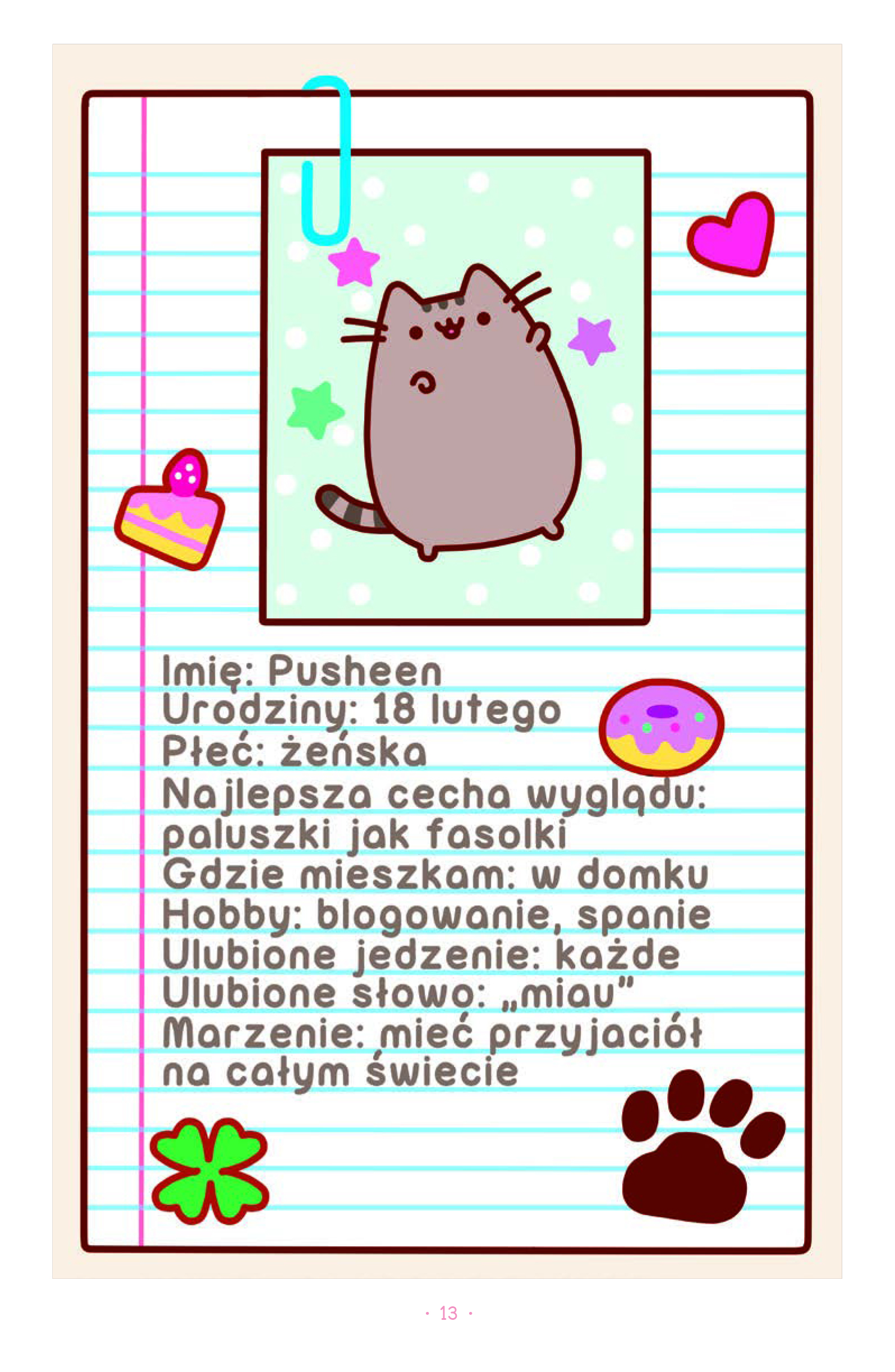 Co trzeba wiedzieć o Pusheen? Urodziny: 18 lutego Płeć: żeńska Gdzie mieszka: w domku, na kanapie, pod nogami Hobby: blogowanie, spanie Najlepsza cecha wyglądu: paluszki jak fasolki Ulubione jedzenie: każde Odkryj, co sprawia, że Pusheen zaczyna mruczeć, i dlaczego miliony osób zakochały się w tej pulchnej, burej kotce. Chyba wszyscy żałują, że nie wymyślili takiej postaci jak Pusheen po tym, jak wynaleziono internet. Możliwe nawet, że Pusheen jest powodem, dla którego w ogóle wynaleziono internet Kate Beaton, autorka Hark! A Vagrant x