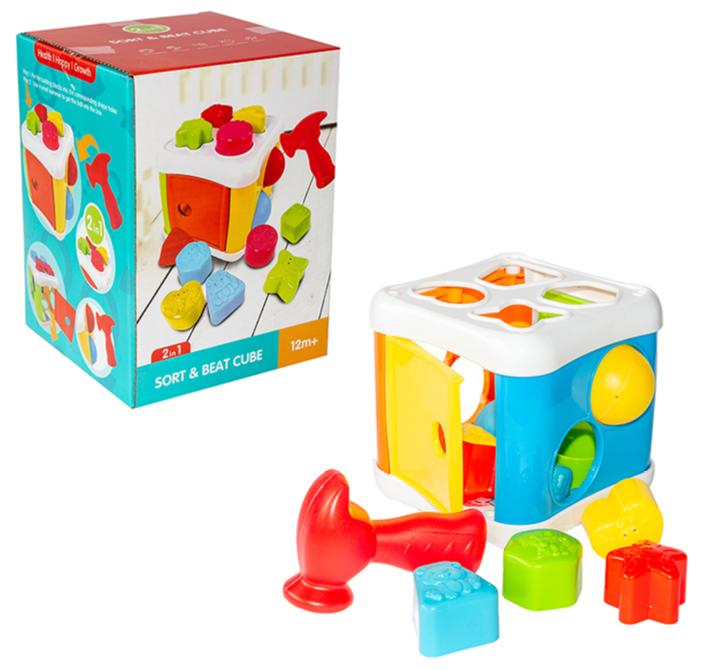 Kostka 14x14x14 cm, sorter klocków, młotek, klocki, piłeczki.